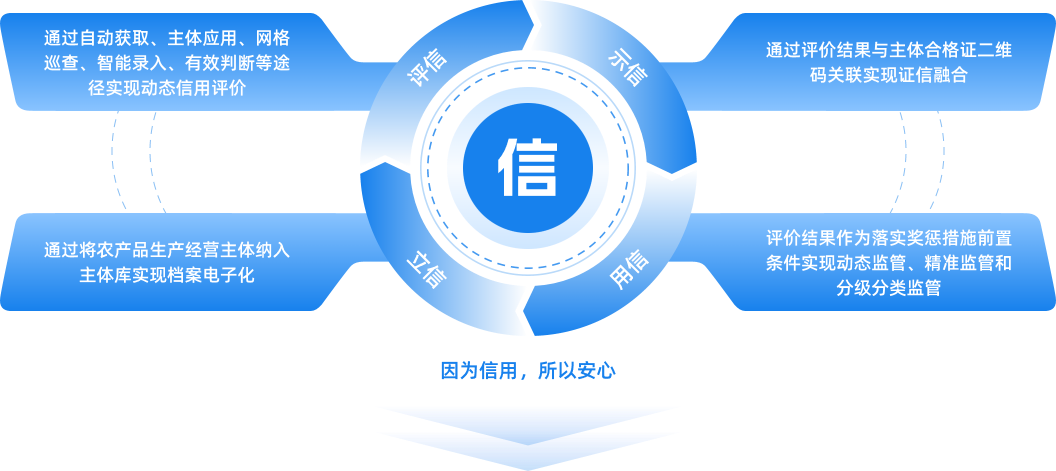 為貫徹落實《國務院辦公廳關于加快推進社會信用體系建設構建以信用為基礎的新型監管機制的指導意見》,深入推動“放管服”改革,發揮信用在創新監管機制、提高監管能力和水平方面的基礎性作用,全國農產品質量安全信用服務平臺構建起“立信、評信、示信、用信”的完整功能鏈條。